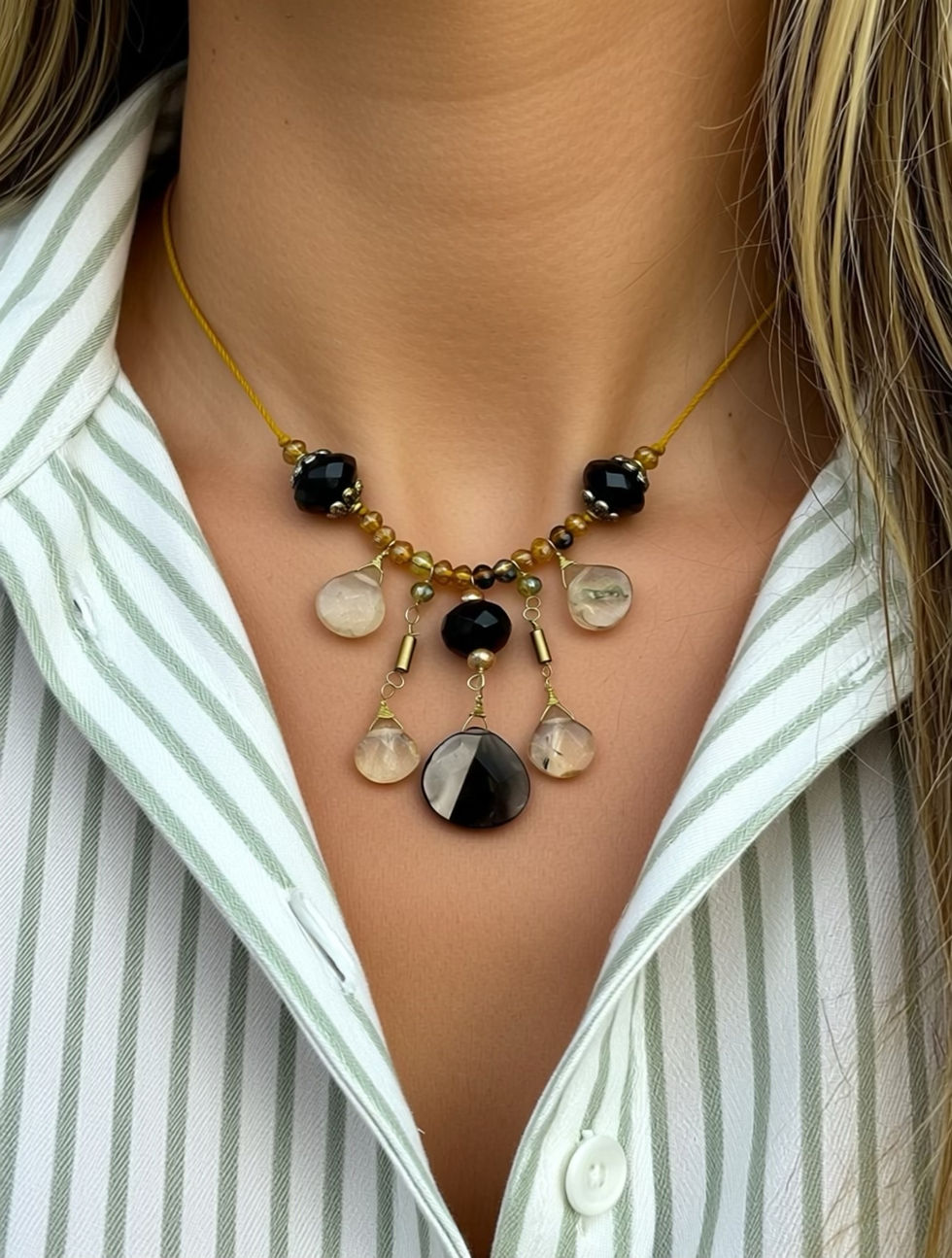 Smoky Quartz, Citrine, Czech Crystals and Black Onyx Cascade Necklace